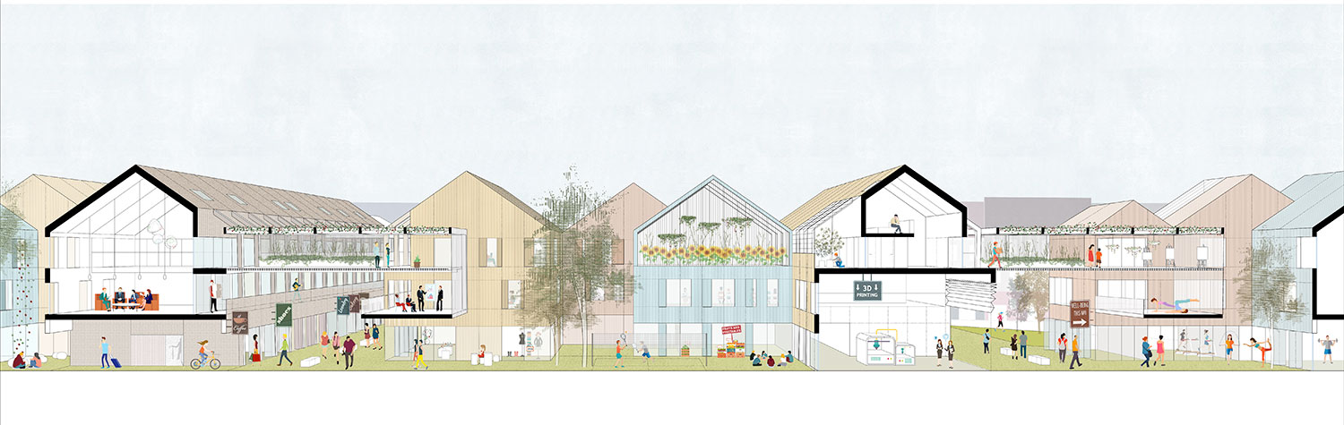 » Espacios para el intercambio social. Cuando los robots asuman gran parte de nuestro trabajo, tendremos más tiempo para compartir y discutir nuestras ideas. El proyecto propone una red de espacios para fomentar encuentros (in)formales en escalas sucesivas, buscando integrar momentos de ocio y creatividad.